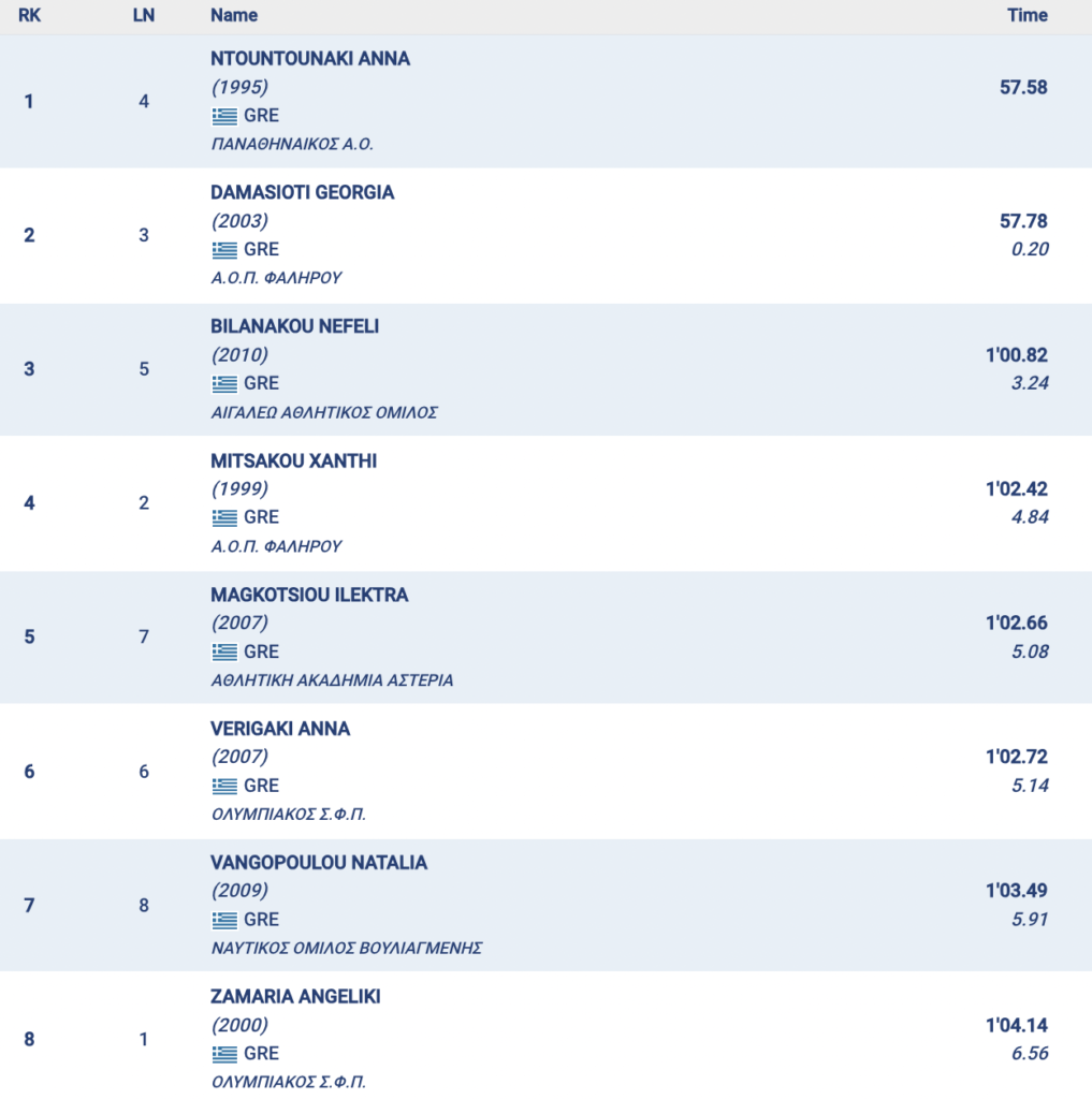 H Άννα Ντουντουνάκη και η Γεωργία Δαμασιώτη κατέβηκαν τα 58 δευτερόλεπτα στον τελικό των 100μ πεταλούδα και πλησίασαν αρκετά τα ατομικά τους ρεκόρ για τη δεδομένη χρονική στιγμή. Η Ντουντουνάκη ακούμπησε πρώτη τον τοίχο σε 57.58 (έχει ατομικό 57.25), ενώ πολύ γρήγορη ήταν και η Δαμασιώτη, η οποία τερμάτισε σε 57.78 (εχει 57.50). Αμφότερες κολύμπησαν γρηγορότερα από το όριο για το Ευρωπαϊκό Πρωτάθλημα του Παρισιού (58.62), για το οποίο έχουν ήδη εξασφαλισμένη τη συμμετοχή τους, ενώ στο βάθρο ανέβηκε και η Νεφέλη Μπιλανάκου με 1:00.82. Η κολυμβήτρια του ΑΟ Αιγάλεω κατέκτησε το δεύτερό της μετάλλιο μέσα στη μέρα μετά το αργυρό στα 50μ ελεύθερο που συνοδεύτηκε με ένα πανελλήνιο ρεκόρ κορασίδων.