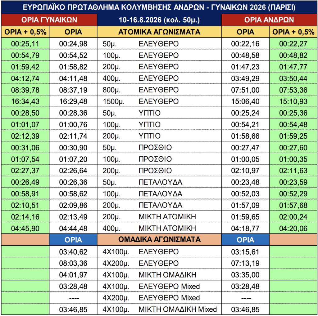 H KOE ανακοίνωσε την διαδικασία πρόκρισης για το Ευρωπαϊκό Πρωτάθλημα κολύμβησης του 2026 και, επτά μήνες πριν, 9 άνδρες και 5 γυναίκες έχουν ήδη εξασφαλισμένα «εισιτήρια».