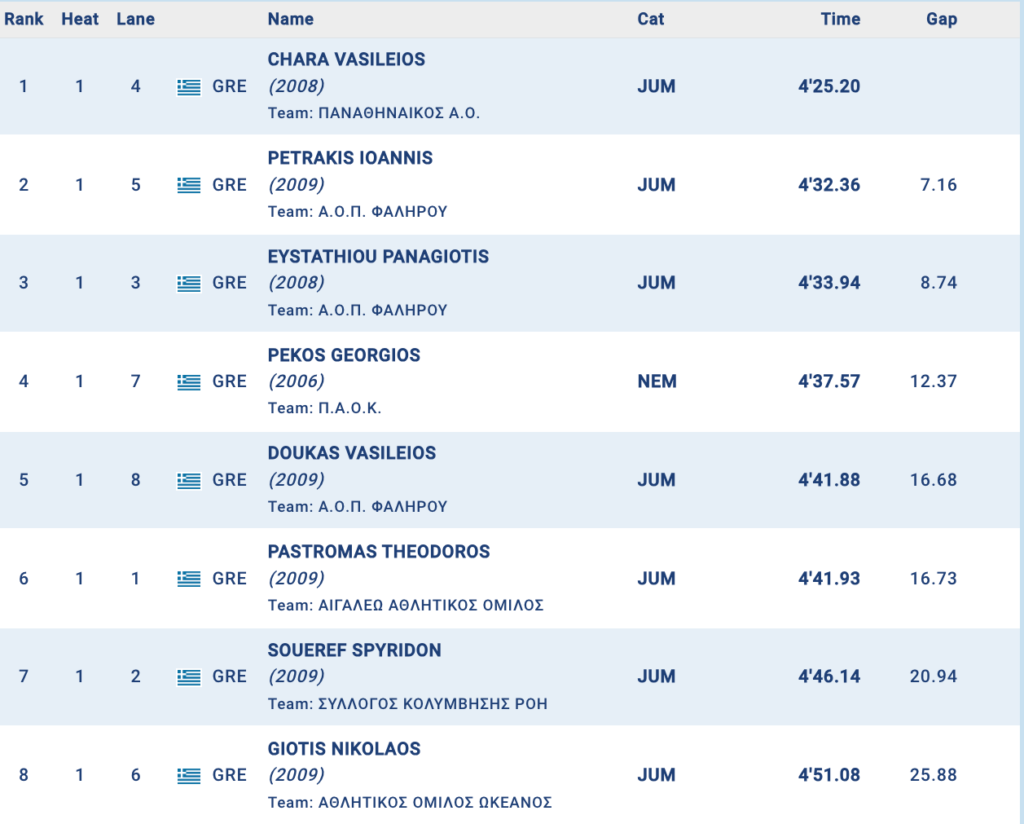 Ο αθλητής του Γιάννη Μηλιδάκη ήταν και μέλος της αποστολής του 2025 στο Σαμορίν χάρη στο ατομικό ρεκόρ που είχε σημειώσει στο Acropolis Swim Meet με 4:23.76, ενώ στο Ευρωπαϊκό στην Σλοβακία είχε πάρει την 12η θέση με 4:27.96.