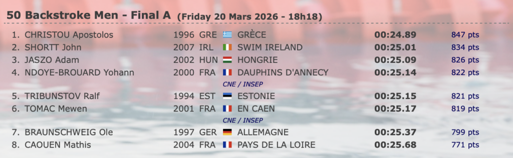 Ο Χρήστου κολύμπησε τρεις κούρσες μέσα σε μια μέρα και κατάφερε να πάρει την πρωτιά στον τελικό των 50μ ύπτιο με 24.89, έναν αρκετά ικανοποιητικό χρόνο δεδομένου ότι είναι ακόμα αρχή της αγωνιστικής σεζόν, σχεδόν 0.5 δευτερόλεπτα μακριά από το ατομικό του ρεκόρ (24.36).