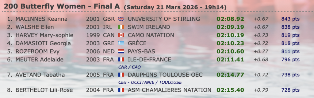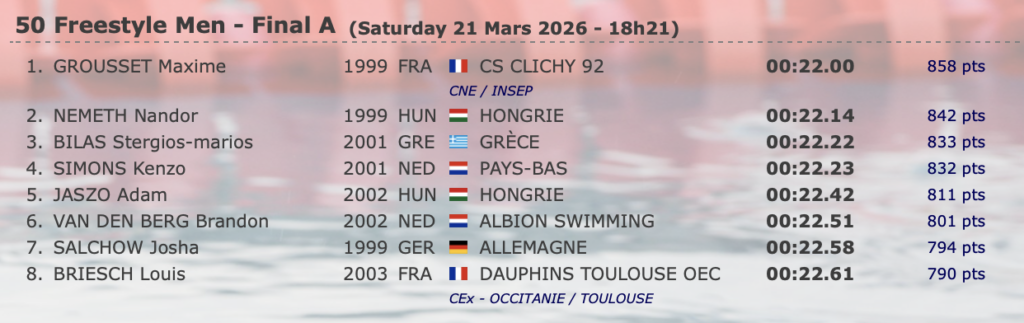 Ο Στέργιος Μπίλας κατέκτησε το χάλκινο στον τελικό των 50μ ελεύθερο με 22.22, την 9η καλύτερη επίδοση της καριέρας του, και σημείωσε την γρηγορότερη κούρσα της καριέρας του τόσο νωρίς στη σεζόν. Σε παρόμοιους ρυθμούς κινήθηκε και η Γεωργία Δαμασιώτη, η οποία ήταν επίσης πολύ γρήγορη για τη δεδομένη χρονική στιγμή και έφυγε με την 4η θέση από τον τελικό των 200μ πεταλούδα, τερματίζοντας σε 2:10.23 (7η επίδοση καριέρας).