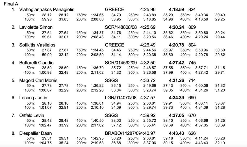 Στο ίδιο αγώνισμα, ο Βασίλης Σοφικίτης πήρε την τρίτη θέση με νέο φετινό ρεκόρ και χρόνο 4:20.78, ενώ εξαιρετική ήταν η 19χρονη Κωνσταντίνα Γκόβαρη, η οποία ακούμπησε τον τοίχο σε 1:08.85 στα 100μ πρόσθιο και έφυγε με την τρίτη θέση, πετυχαίνοντας νέο ατομικό ρεκόρ (είχε 1:09.69). Η Γκόβαρη έφτασε κοντά στο πανελλήνιο ρεκόρ γυναικών (1:08.39) και ακόμη πλησιέστερα στο αντίστοιχο ρεκόρ Κ23 (1:08.66), δείχνοντας ότι είναι πολύ πιθανό να το καταρρίψει στους επόμενους αγώνες.