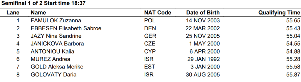 Η χρυσή μεσογειονίκης του Οράν το 2022 έχει μία μεγάλη ευκαιρία για να κολυμπήσει τον πρώτο της διεθνή τελικό σε ευρωπαϊκό ή παγκόσμιο επίπεδο. Είναι ανάμεσα στα φαβορί για την πρόκριση και αν κολυμπήσει λίγο πιο γρήγορα σε σχέση με το πρωί, μπορεί να τα καταφέρει. Η Κύπρια πρωταθλήτρια έχει φορμαριστεί για αυτή τη διοργάνωση και αν αποφύγει τα λάθη αναμένεται να γράψει 54 χαμηλό κοντά στο 54.24 που είναι το ατομικό της από το Οράν. Έχει όλα τα φόντα ακόμα και για να καταρρίψει το φράγμα του 54.00, κάτι που αποτελεί προαπαιτούμενο αν θέλει να διεκδικήσει το Ολυμπιακό όριο Α (53.61) ή το Ολυμπιακό όριο Β (53.88). Οι ηχηρές απουσίες στο αγώνισμα ανοίγουν και ένα παραθυράκι για το βάθρο.