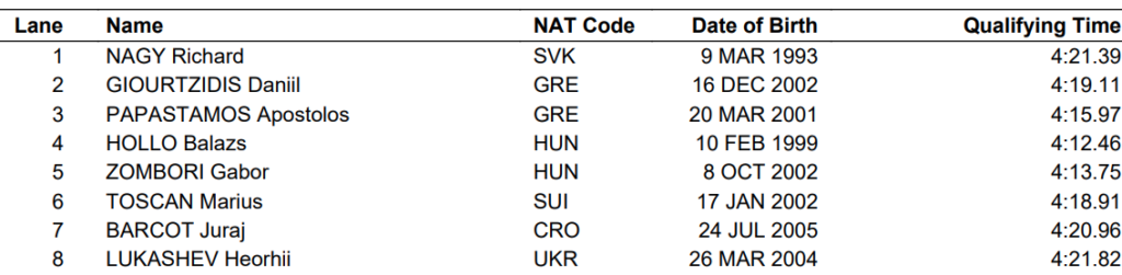 Δεν πρέπει όμως κανένας να ξεχνά και τον Δανιήλ Γιουρτζίδη. Ο 22χρονος έχει αποδείξει ότι διαθέτει ψυχολογία αγώνων και τα τελευταία χρόνια έχει καταφέρει να βελτιώνεται σταθερά. Πέρασε στον τελικό με την 5η επίδοση, ένα τίμιο 4:19.11 για πρωί, και μπορεί κάλλιστα να ξεπεράσει το απόγευμα το 4:17.99 και να κάνει την μεγάλη υπέρβαση. Έχει ήδη βγει κερδισμένος από το πρωτάθλημα με την είσοδο στον τελικό και τώρα έχει τη ευκαιρία να ξεχωρίσει στη μεγάλη σκηνή.