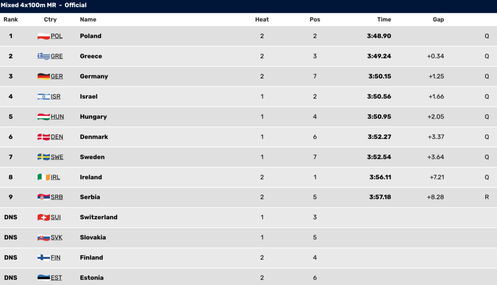 Με ένα αξιόλογο 3:49.24 για πρωινή κούρσα η τετράδα των Βαγγέλη Μακρυγιάννη, Γιώργου Ασπουγαλή, Γεωργίας Δαμασιώτη και Νόρας Δράκου εφυγε για τελικό. Η ελληνική ομάδα τερμάτισε 2η στην 2η προκριματική σειρά πίσω μόνο από την Πολωνία (3:48.90) και πέρασε με τον δεύτερο καλύτερο χρόνο στον απογευματινό τελικό, εκεί όπου θα τα δώσει όλα για τη διάκριση. Το επίπεδο στο αγώνισμα ήταν χαμηλό με 4 χώρες να αποσύρουν τις συμμετοχές τους και μόνο 9 να παίρνουν θέση στον βατήρα.