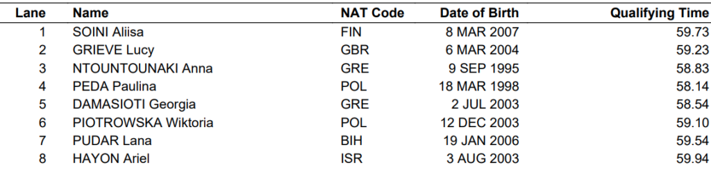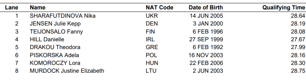 Η Νόρα Δράκου είναι έτοιμη για την μεγαλύτερη κούρσα της καριέρας της (μέχρι τώρα θα πούμε εμείς), τον τελικό των 50μ ύπτιο όπου διεκδικεί με αξιώσεις ένα μεγάλο μετάλλιο, το πρώτο της σε μεγάλη διεθνή διοργάνωση μετά από 14 χρόνια συνεχούς παρουσίας. Έχει τον δεύτερο καλύτερο χρόνο, είναι σε εξαιρετική κατάσταση και μπορεί να βελτιώσει το δικό της πανελλήνιο ρεκόρ του 27.84. Αν τα καταφέρει, έχει βάσιμες ελπίδες για βάθρο.