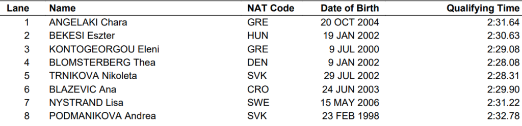PB 2:27.68 | SB 2:28.14 | NR 2:27.39