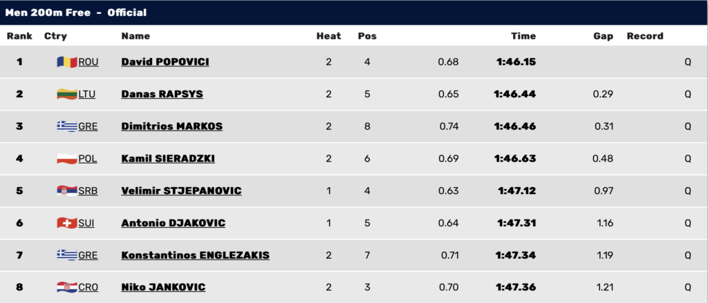 Ο Μάρκος και ο Εγγλεζάκης έκαναν πολύ καλές εμφανίσεις στην 2η ημιτελική σειρά των 200μ ελεύθερο και τερμάτισαν στην 3η και την 5η θέση αντίστοιχα. Ο Μάρκος με χρόνο 1:46.46 βελτίωσε το δικό του πανελλήνιο ρεκόρ ανδρών και νέων ανδρών που ήταν 1:46.65 από πέρυσι και προκρίθηκε στον τελικό με την 3η καλύτερη επίδοση, ενώ ο Εγγλεζάκης τερμάτισε σε 1:47.34, νέο ατομικό ρεκόρ, και θα πάρει θέση στον τελικό με τον 7ο καλύτερο χρόνο.