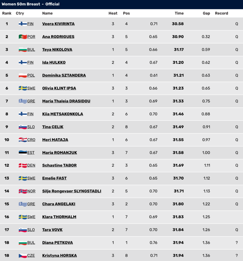 Αγγελάκη: «Ήμουν στην άκρη της πισίνα και περίμενα να δω τον πίνακα, ευτυχώς περάσαμε ημιτελικό. Δεν είναι ότι είμαι κουρασμένη, απλά είναι η πρώτη φορά που έρχομαι σε μεγάλη διοργάνωση και η αλήθεια είναι ότι ήμουν λίγο αγχωμένη. Είμαι χαρούμενη για την πρόκριση, αλλά ο χρόνος δεν με αντιπροσωπεύει, θα ήθελα κάτι καλύτερο το απόγευμα, πιο κοντά στο ατομικό μου, το 31.27».