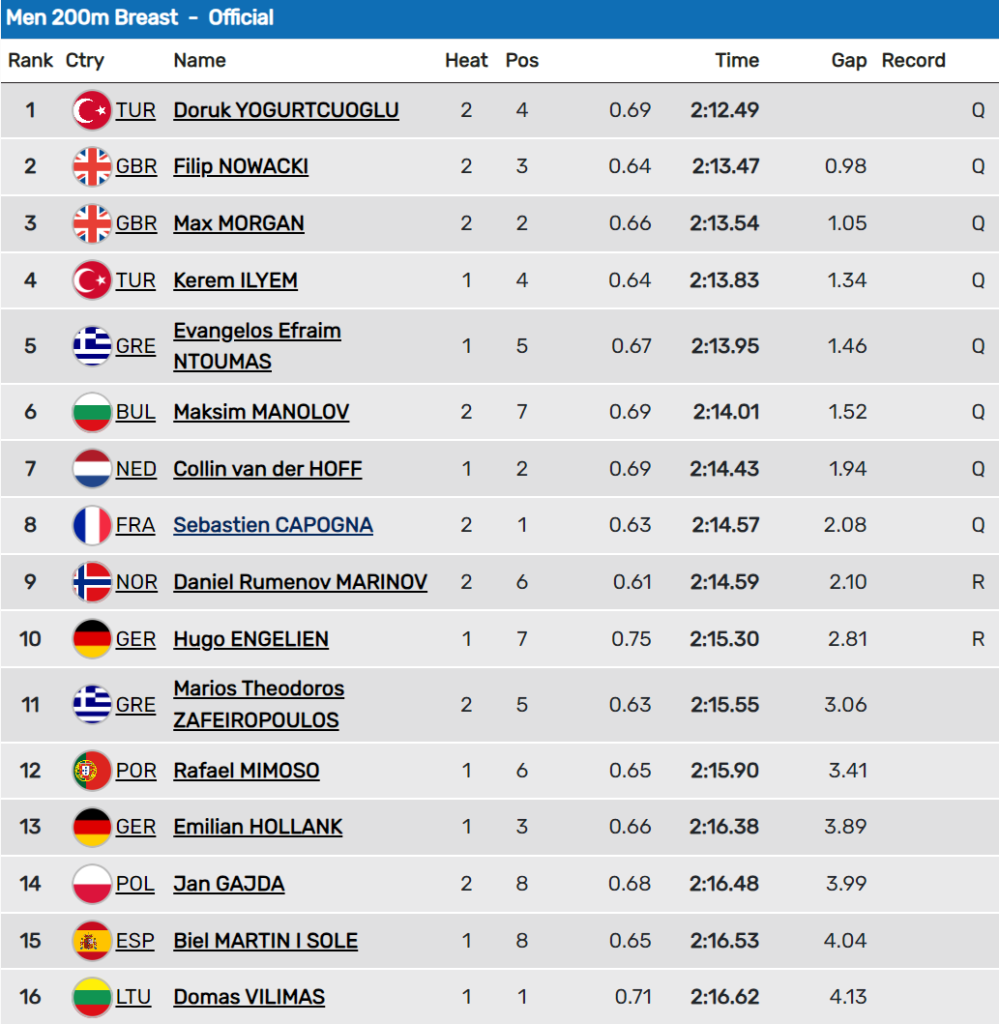 Ο Βαγγέλης Ντούμας εξασφάλισε παρουσία στον πρώτο του τελικό στο πρωτάθλημα με την εμφάνισή του στον ημιτελικό των 200μ πρόσθιο, ενώ με την 11η θέση στην Ευρώπη φεύγει ο Μάριος Ζαφειρόπουλος.