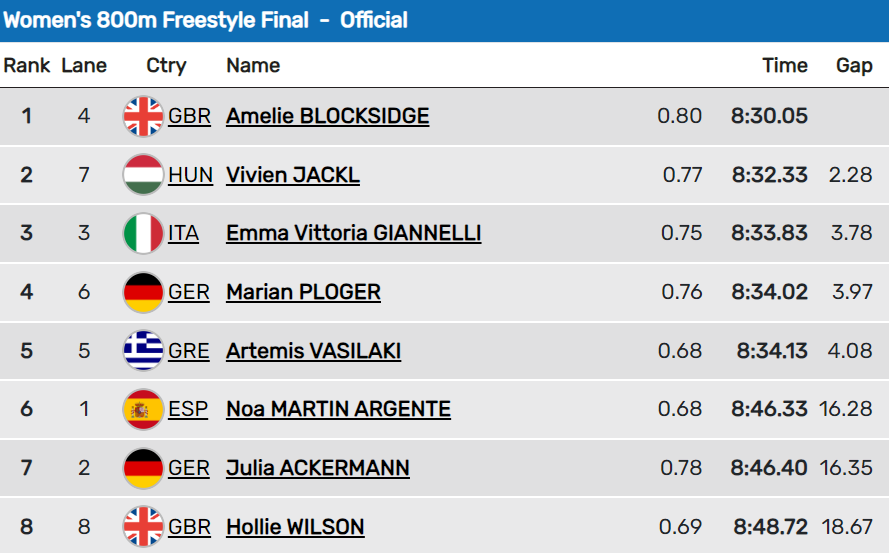 Η αθλήτρια του Γιώργου Σούρδη τερμάτισε 5η στον τελικό των 800μ ελεύθερο σε 8:34.13, επίδοση καλύτερο τόσο από την καλύτερη επίδοση στην κατηγορία των νέων γυναικών (Κ23) που είχε κάνει το 2008 η Ελευθερία Ευσταθίου με 8:37.53, όσο και από το πανελλήνιο ρεκόρ της σπουδαίας Μαριάννας Λυμπερτά, το 8:34.81 από το 2010. Παράλληλα βελτίωσε το δικό της ρεκόρ νεανίδων. Πλέον η Βασιλάκη έχει κάνει δικά της τα δύο από τα τρία πανελλήνια ρεκόρ γυναικών στις μεγάλες αποστάσεις του ελεύθερου (400-800μ) και της απομένει μόνο αυτό των 1500μ, το 16:20.11 της Λυμπερτά.