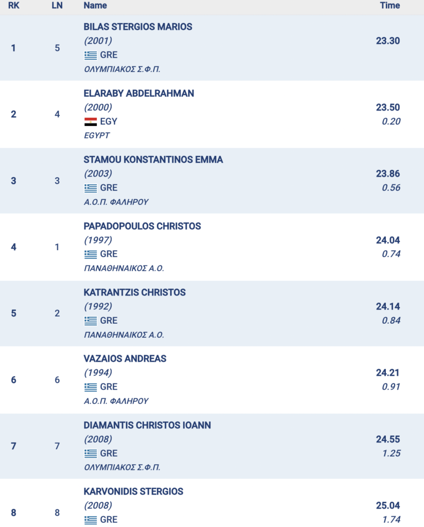 Ο πολύ γρήγορος Αιγύπτιος Αμπντελραχμάν Ελαραμπί (ατομικό ρεκόρ 22.80) τερμάτισε δεύτερος σε 23.50, ενώ ο Κώστας Στάμου (ΑΟΠΦ) με 23.86 πήρε το χάλκινο και πλησίασε το ατομικό του ρεκόρ που είναι 23.78. Καλή κούρσα έκανε και ο τέταρτος, Χρήστος Παπαδόπουλος (ΠΑΟ), με 24.04.